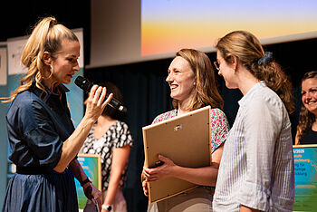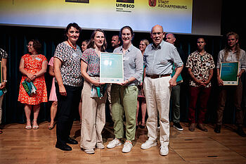 Am 28. Juni übergaben in der Stadthalle Aschaffenburg die Leiterin des Referats Bildung in Regionen, Bildung für nachhaltige Entwicklung im Bundesministerium für Bildung und Forschung (BMBF), Frau Dr. Andrea Ruyter-Petznek, und Walter Hirche, Vorstandsmitglied der Deutschen UNESCO-Kommission, die Auszeichnung und betonten die Relevanz der Anerkennung von BNE-Akteurinnen und -Akteuren für die Förderung der globalen Nachhaltigkeitsziele.